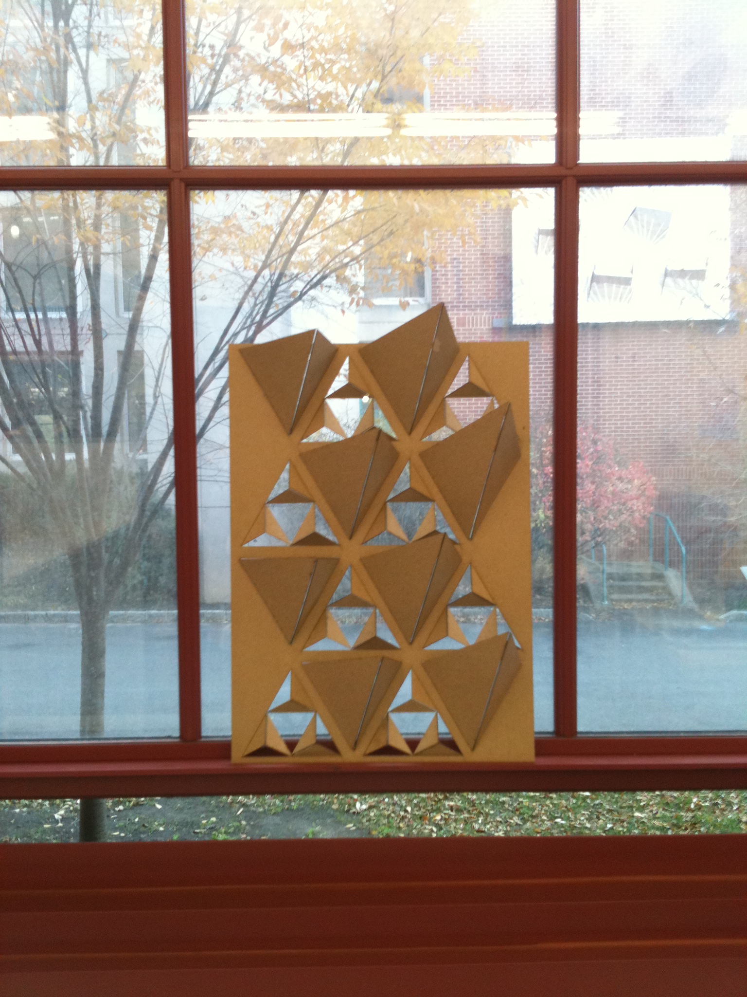 Since I want to cover the whole window, I changed the scale, however, the limited size for laser cutting is 32×18. I decided to use each triangle as a unit. The problem is how to hold them together. So i tried this structure as below,