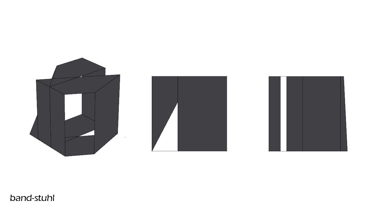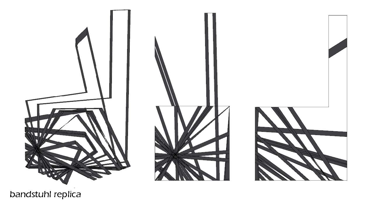 I created this chair using a series of grasshopper definitions where the geometry was based upon a brep of the chair’s general form. A series of sections were taken, with the density controlled by the number of sections cut through the form. Their XY angles determined by a “Random” function and their YZ angularity based upon the added slider. The sections generated were then offset, with thickness being determined by the amplitude of this offset. The sections were deplaned & the points on each line were reorder so that a loft between them would generate only flat bands and then a conditional statement was added such that any pairing that did not occur between two polylines with the same number of segments would be culled.