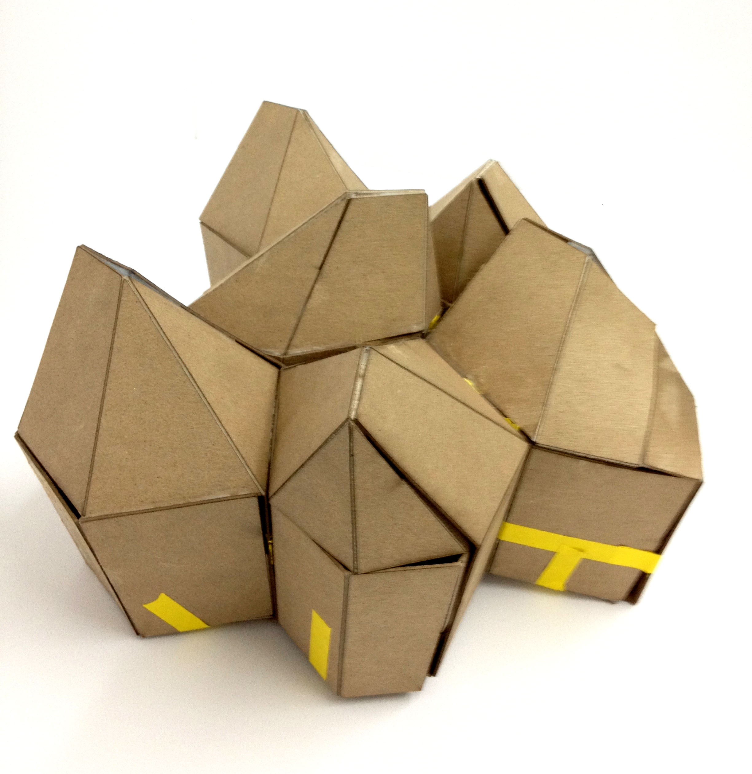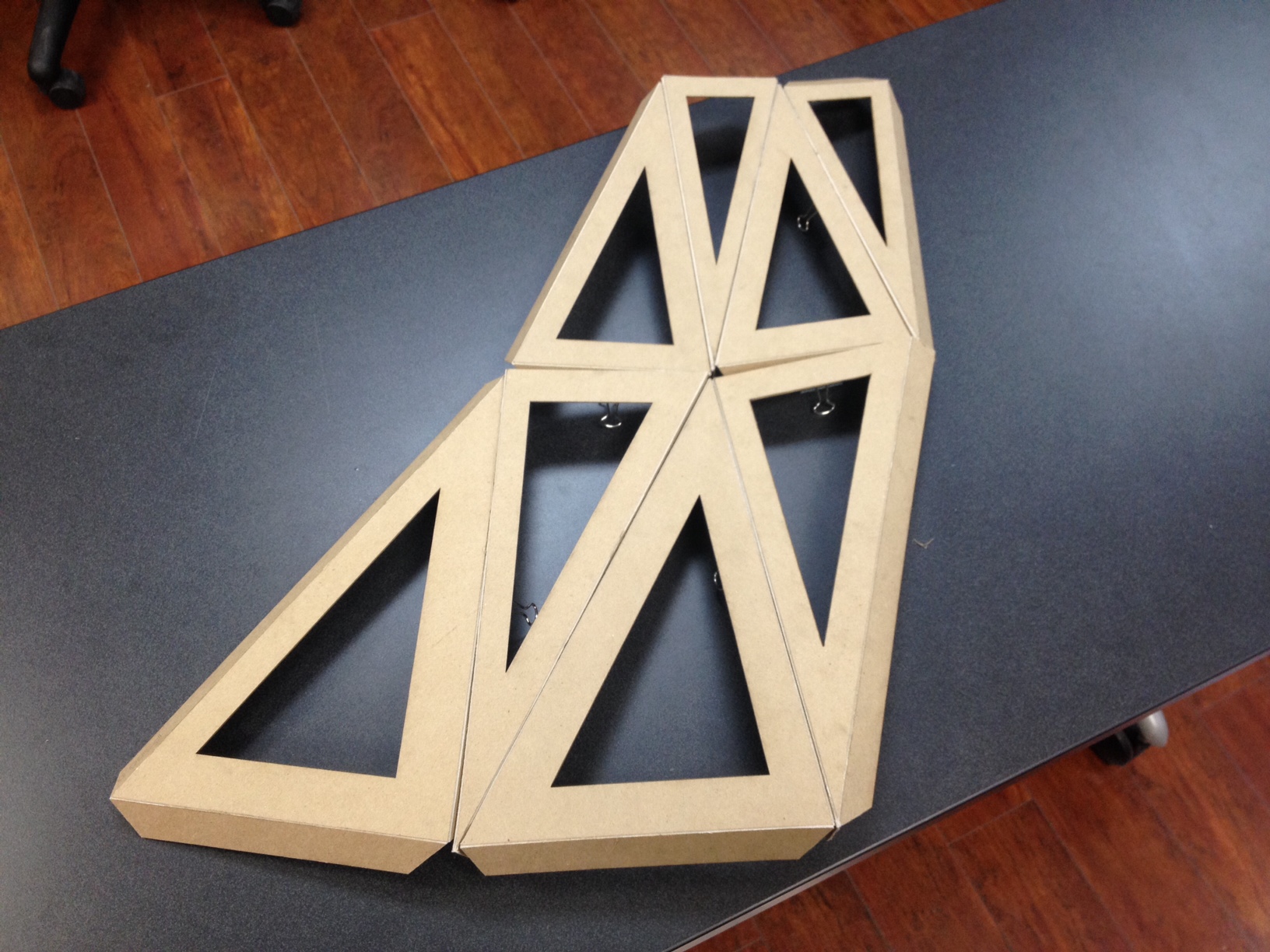 Using an unroll script (courtesy of Ben Howes!), we were able to unroll a couple of our tiles to make a prototype. Making it made us realize a couple of hiccups that still need to be worked out. For example, the unroll causes the bottom plane to be broken apart, not all faces are planar, and we need to create some sort of numbering/labeling system to help us figure out what face gets attached to what face.