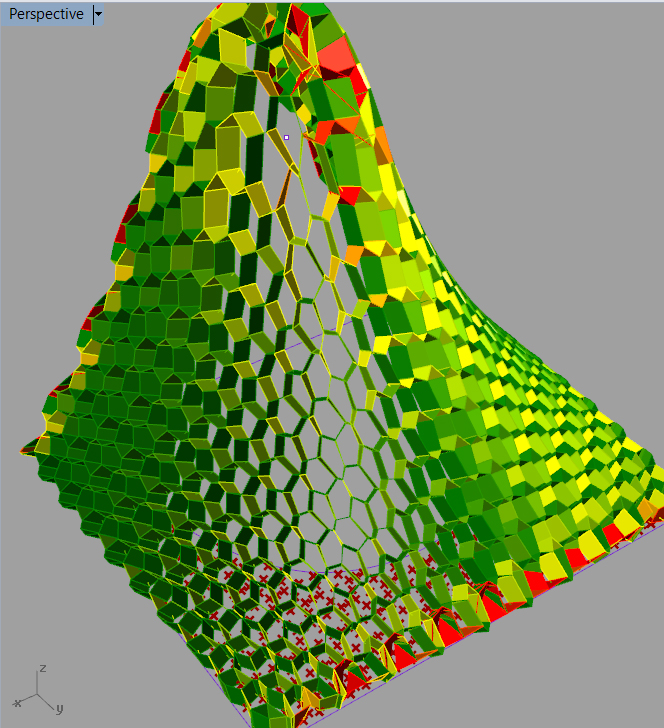 The form finding with anchor points and anchor springs that Ella and I had worked on has been causing some new planarity problems with the walls. The transition from parallel to floor to perpendicular to floor isn’t smooth enough. (Red=bad)