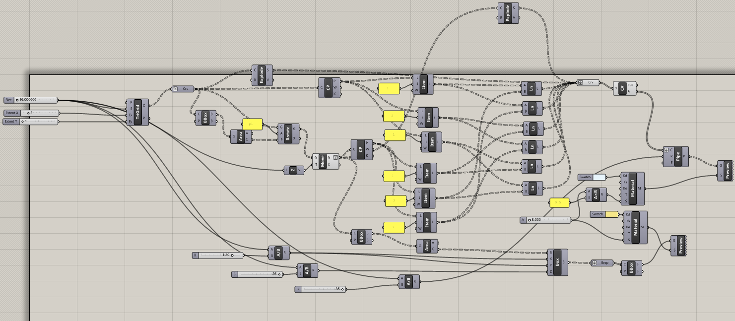 In the grasshopper file, the initial hexagonal cells were generated with lunchbox, and I also experimented with two forces in kangaroo physics in order to manipulate the geometry of openings.