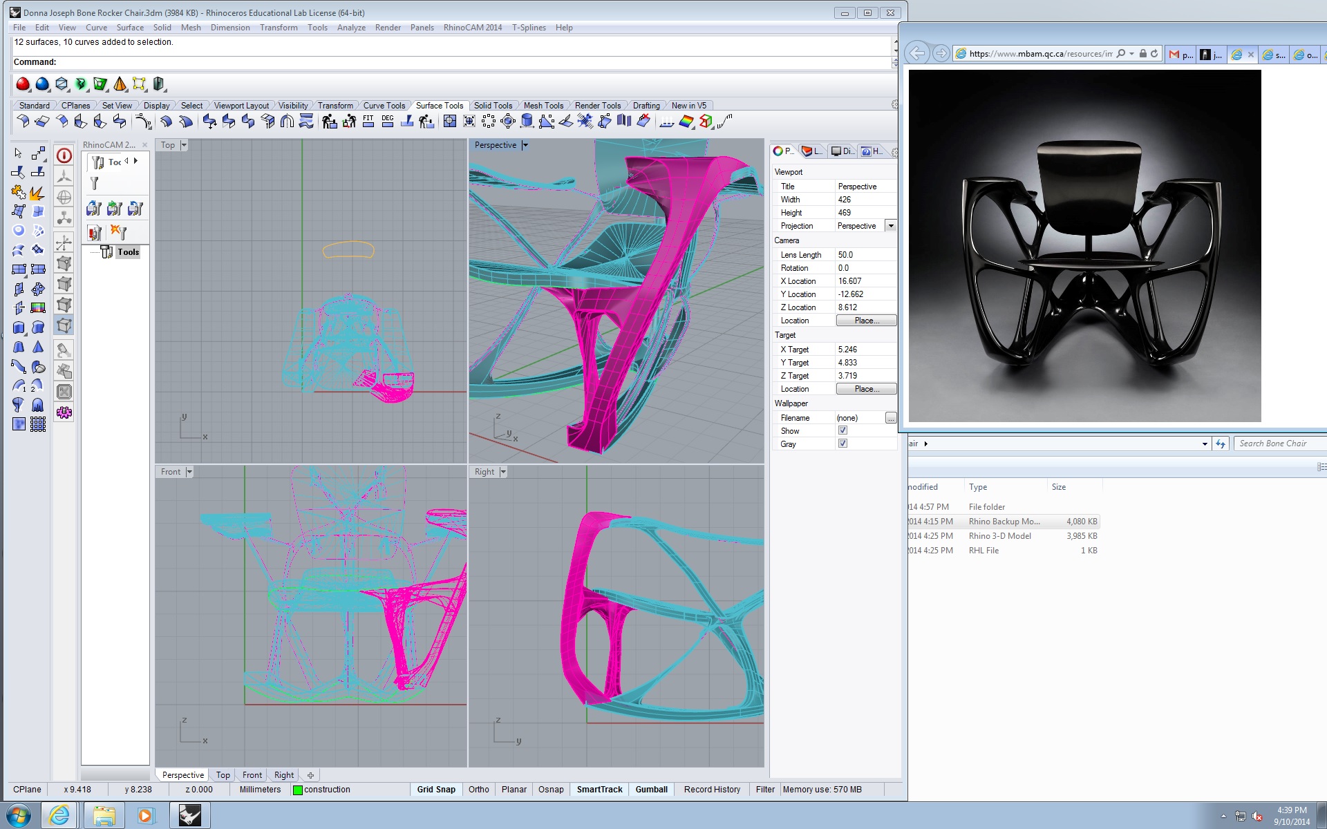 I started with the base rocker, then the armrests, and seat. I used lofting to connect the pieces and would play with the loft tool so the piece would loft along the curve I wanted it to follow. Extruding didn’t really work in my favor. It would only extrude the curves and the surface would be hollow. I used the gumball tool a lot to manipulate where I wanted the curves to be. Working with all four windows worked best for me so I knew where my curves and lines were on the chair.