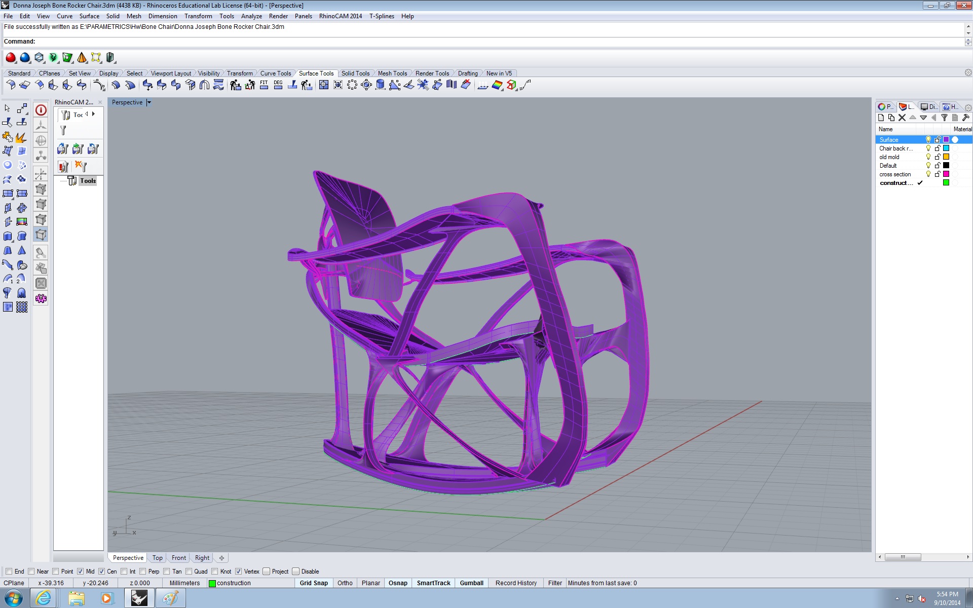 Have a model in *.STL format. (You just need to save the rhino file as an *.stl). However, you need to make sure your surface model is a mesh or it won’t print. Submit the file to the tech, you pay (hopefully not a crazy amount –Good Luck), and then you wait to pick it up. The amount of time it takes to print depends on how complex the model is, plus an addition 4-5hours for washing. For example, my original model would have taken 21 hours just to print (without washing). The model I went with was much simpler and it took about 5 hours to print and 5 more to wash.
