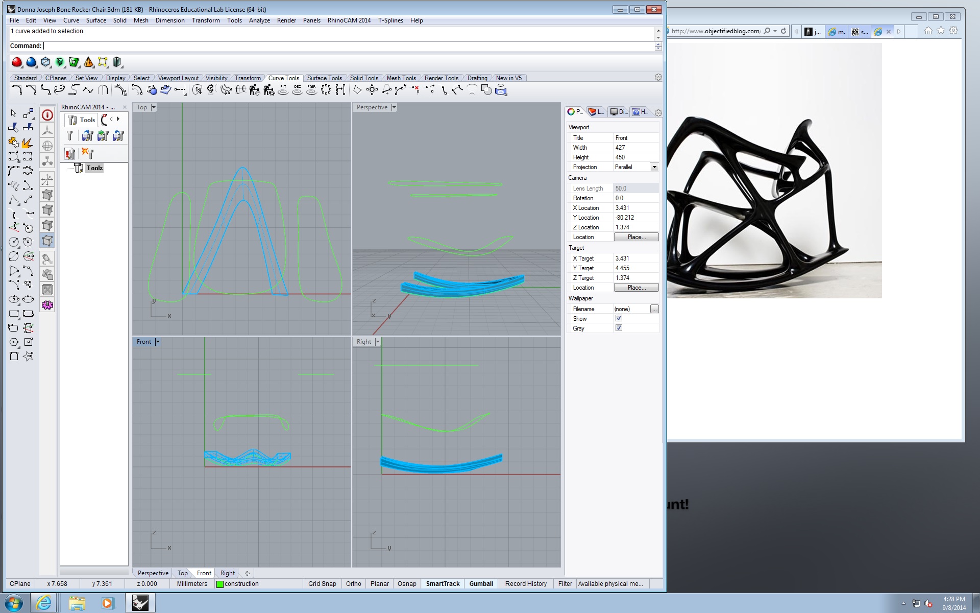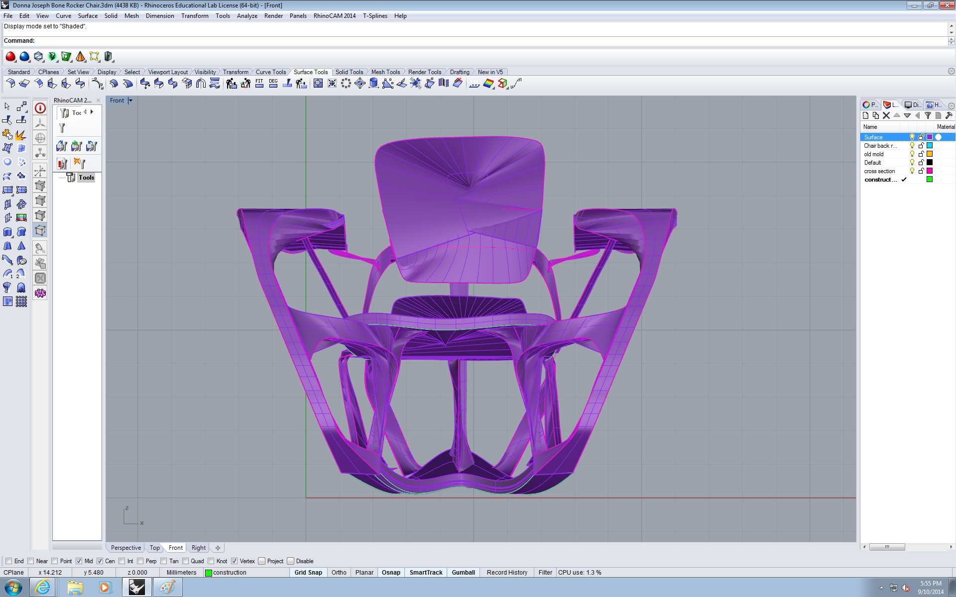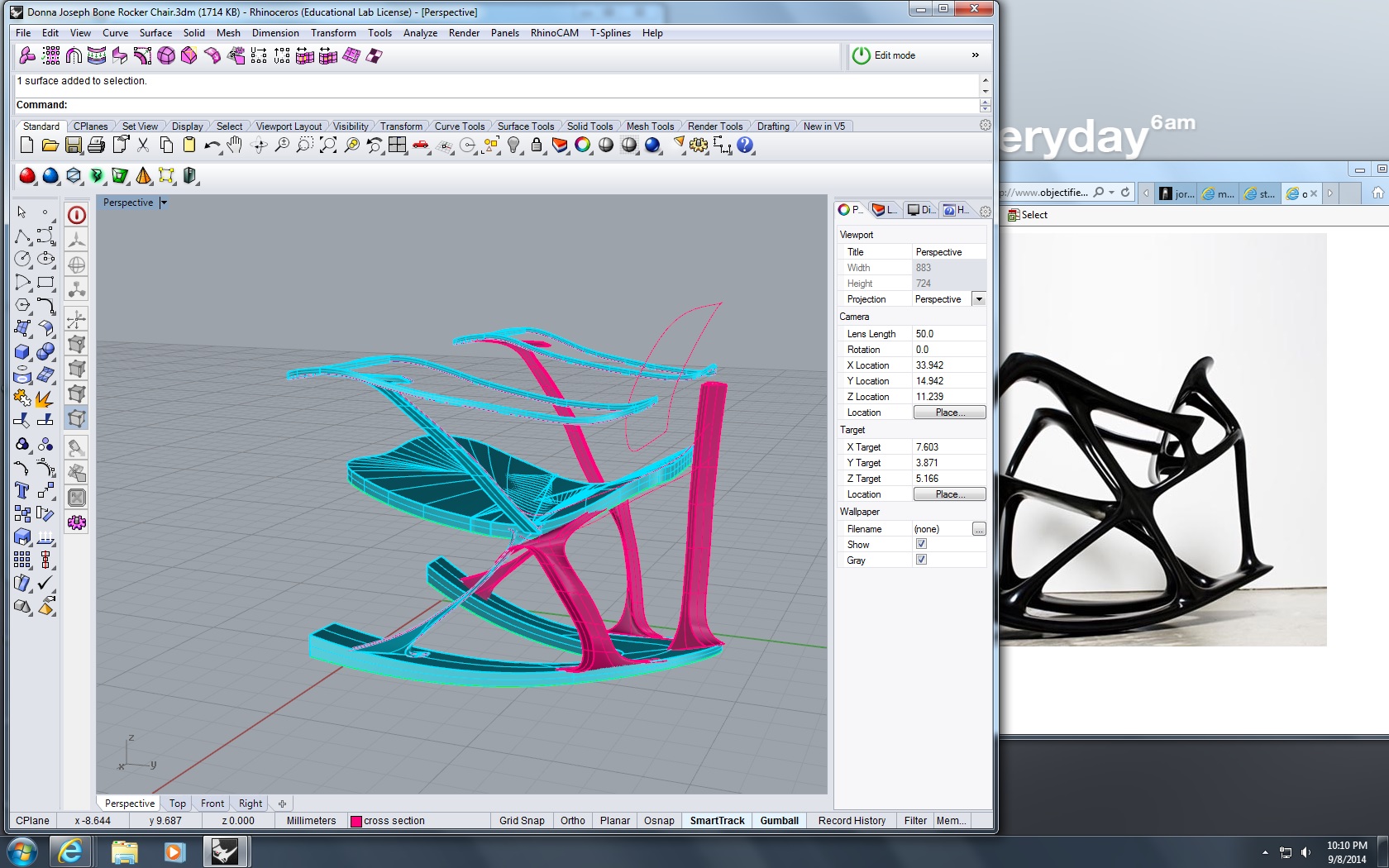 When I started doing the legs, I found it best to mirror the objects so I wouldn’t have to rebuild everything and worry about everything matching up correctly, which I realized that the beginning portion of my model therefore may not have been accurate i.e. the base rocker. (Maybe one side bigger than the other. I decided to use the mirror tool a lot then to try to make the model as accurate as possible. By the time I reached the front rocker legs (connecting the front of the armrest and the base rocker), my gumball tool starting having trouble. It would lock onto certain distances and wouldn’t be as flexible. I don’t know if this is a setting issue (maybe I hit a button) or if the file was getting too big/complex with all of the curves and lofting I did with this chair.