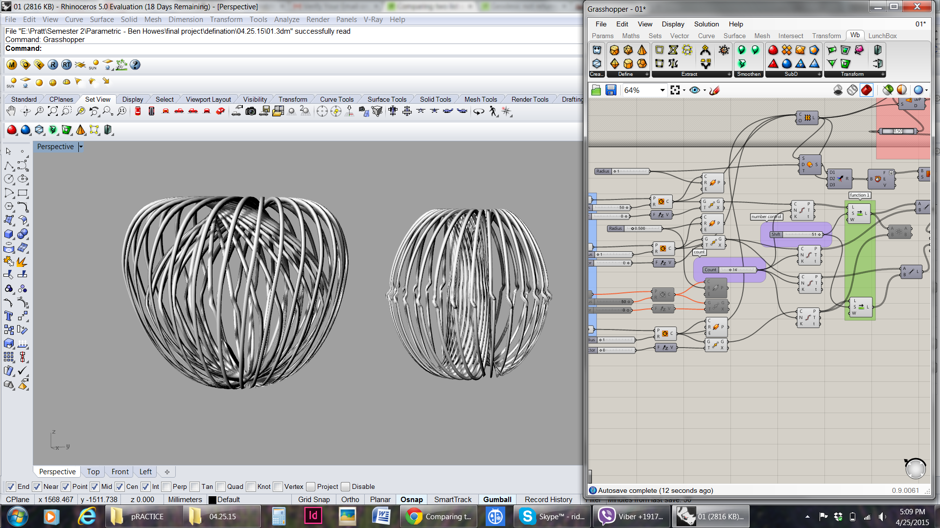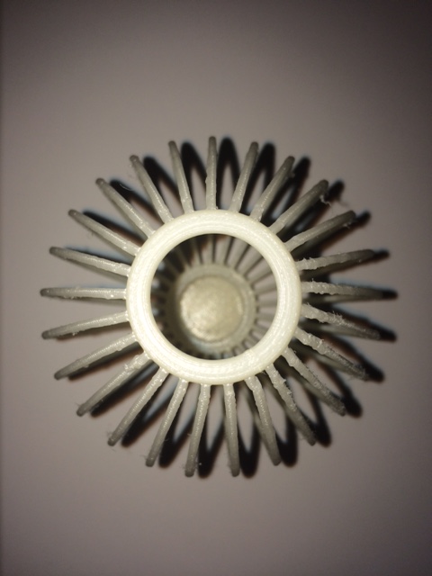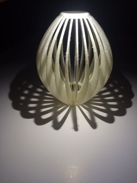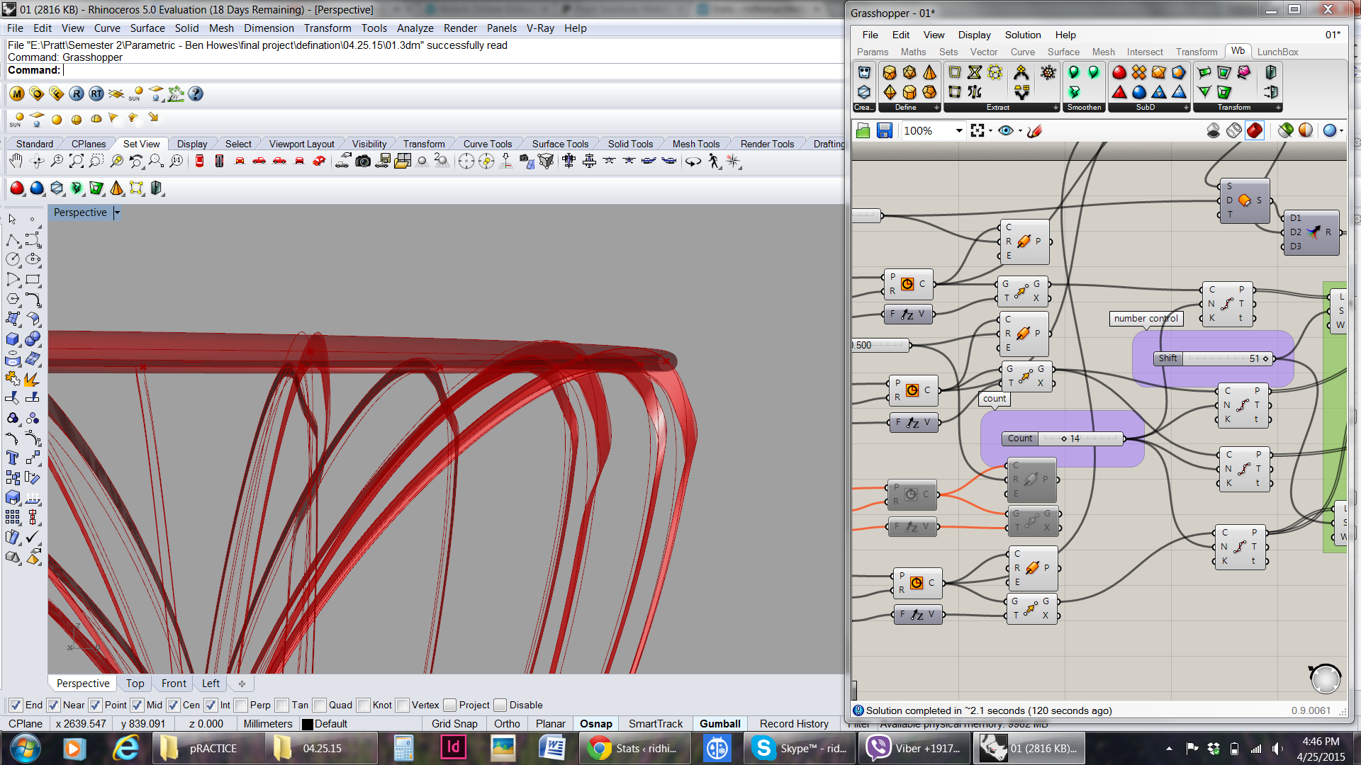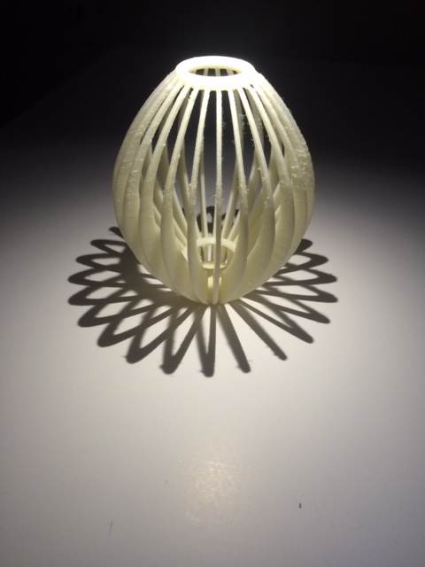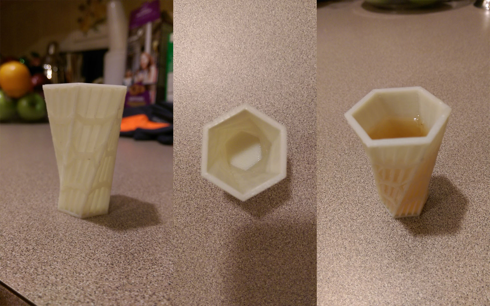 I was able to print a cup and actually make it hold liquid– rum in this case ;) It holds almost exactly 1 oz and stands about 2″ tall. The last cup I printed had holes in the base. Using my Grasshopper definition and a bit of editing in Rhino, I was able to make a solid object that printed successfully in 3 hours on the Dimension printer on campus.