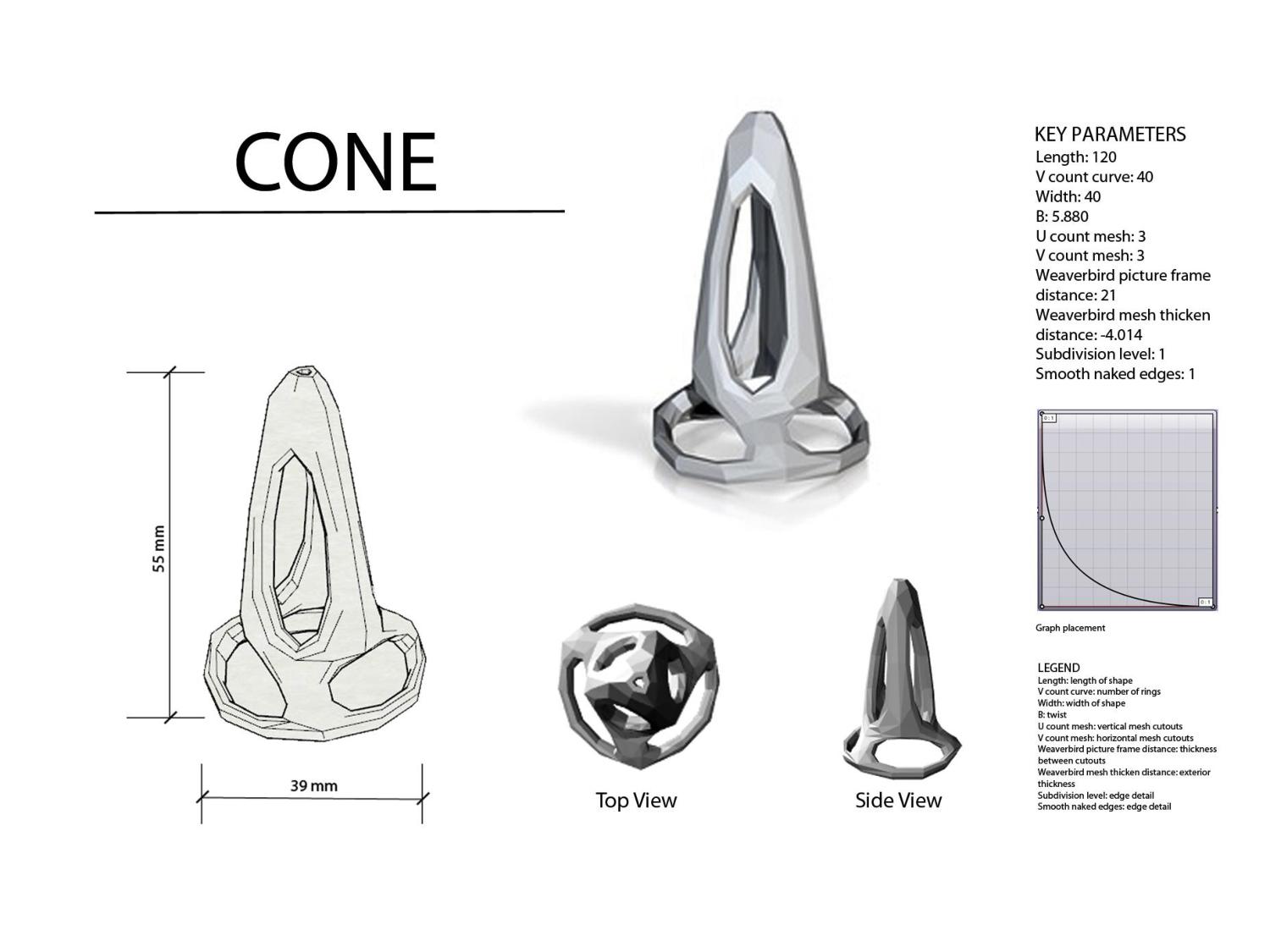 The Geos, short for geometric, were inspired by highly geometric honeycomb shapes creating a delicate pattern of interwoven forms. The Geos consists of 5 different ring holders all belonging to the same family: The Circle, Triangle, Cylinder, Cone and Prism. With its many unique cutouts and shapes the Geos present a beautiful array of display pieces, which will compliment your displayed ring.