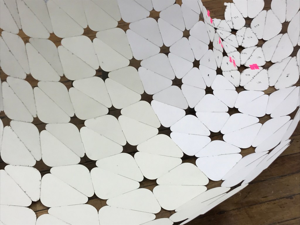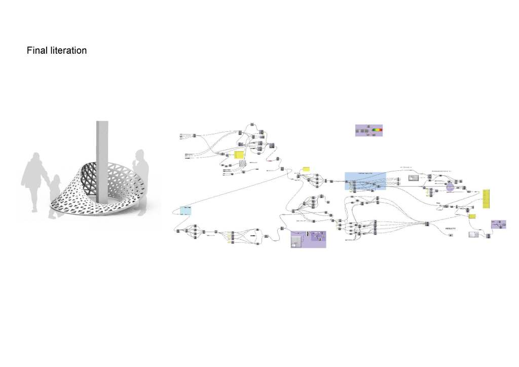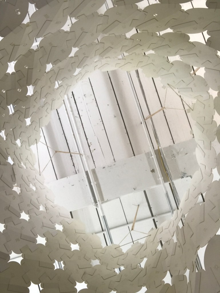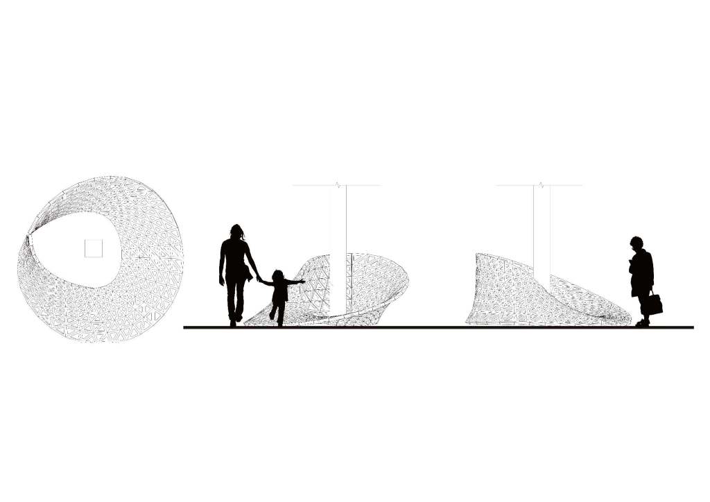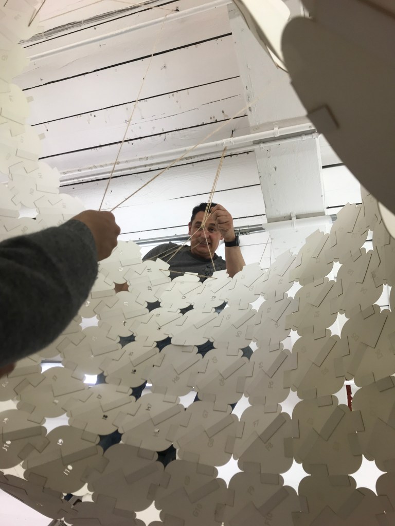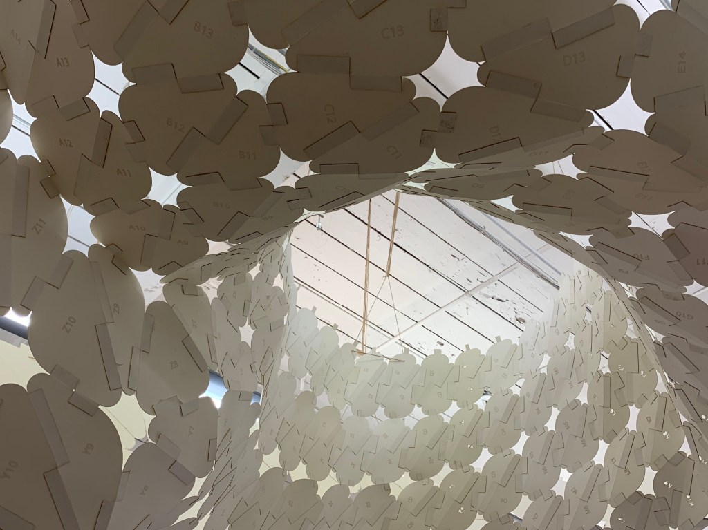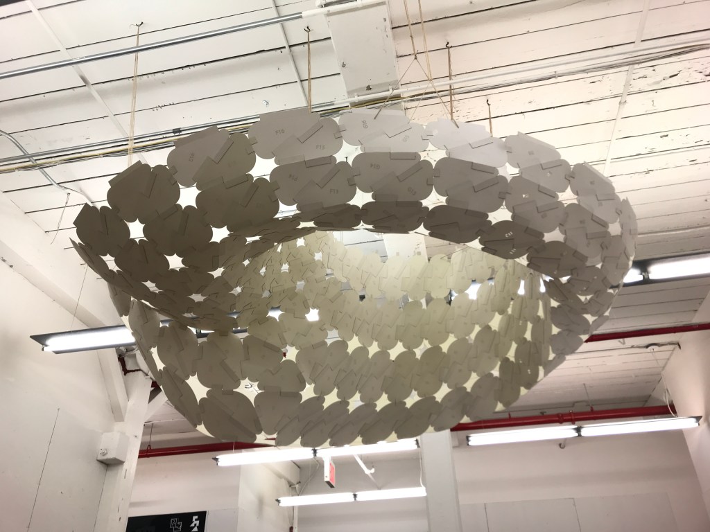 is a parametric free hanging intervention that creates a semi enclosed space with its net-like center. The shape was conceived by connecting two differently sized rings. Physics simulations were applied to identify how the connections would drape in real life. Through iterative prototyping, several hundred panels were cut and assembled that could not only support each other when linked but can also be printed flat on a laser cutter bed.