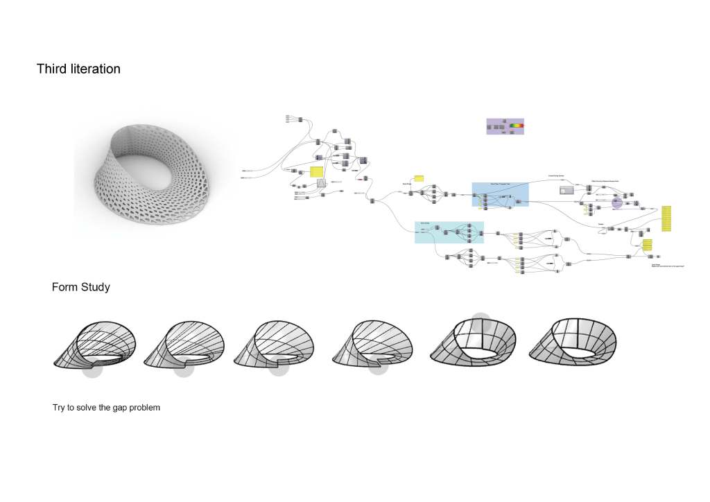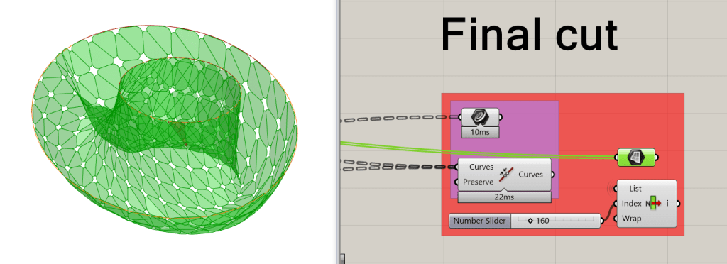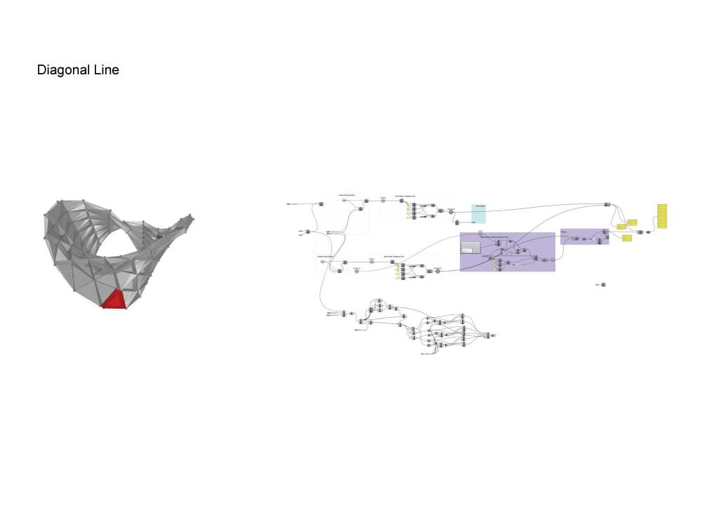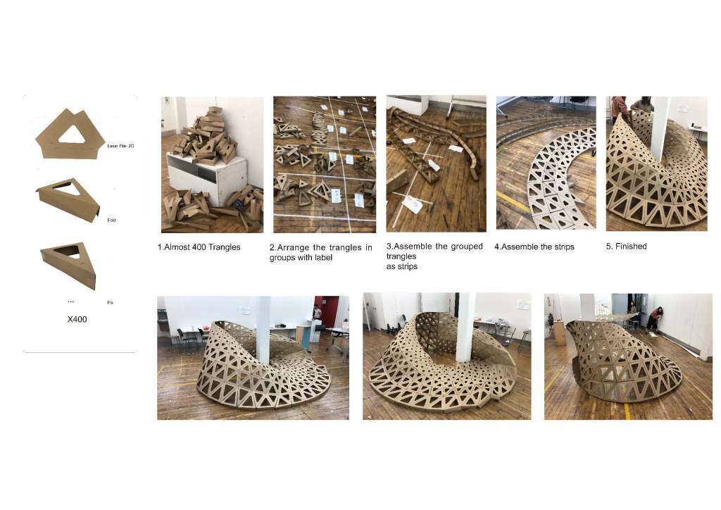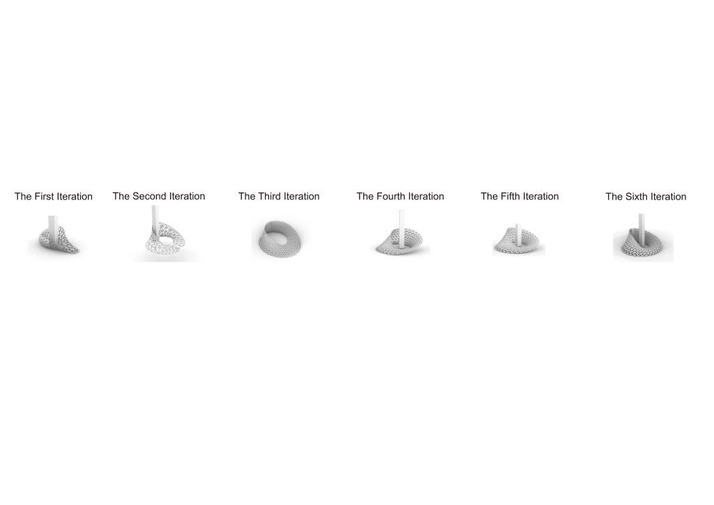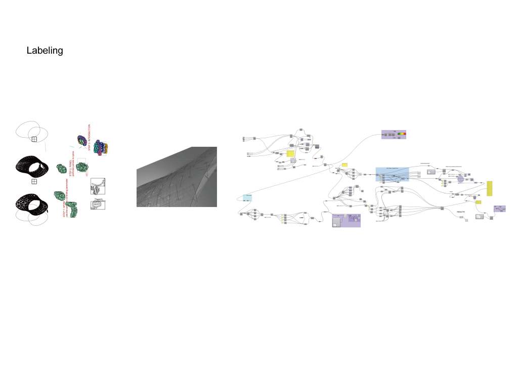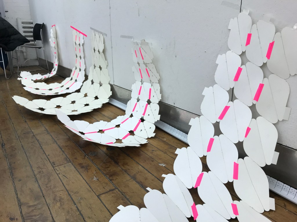 is a parametric free hanging intervention that creates a semi enclosed space with its net-like center. The shape was conceived by connecting two differently sized rings. Physics simulations were applied to identify how the connections would drape in real life. Through iterative prototyping, several hundred panels were cut and assembled that could not only support each other when linked but can also be printed flat on a laser cutter bed.
