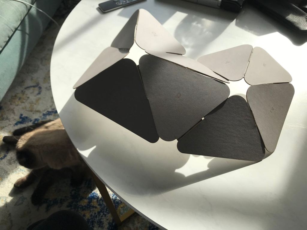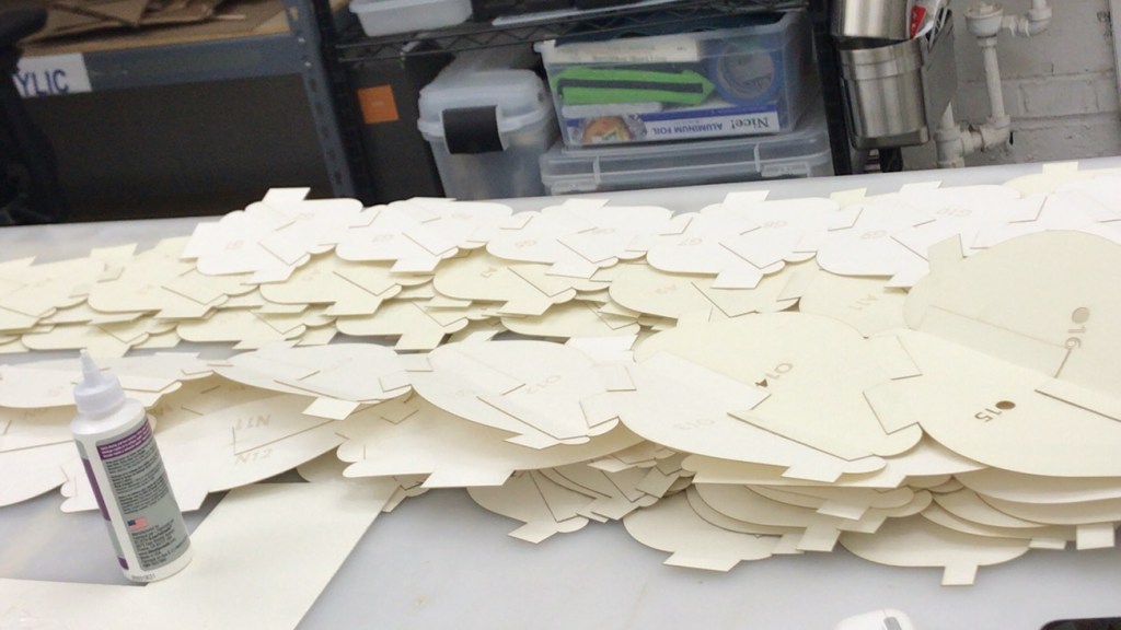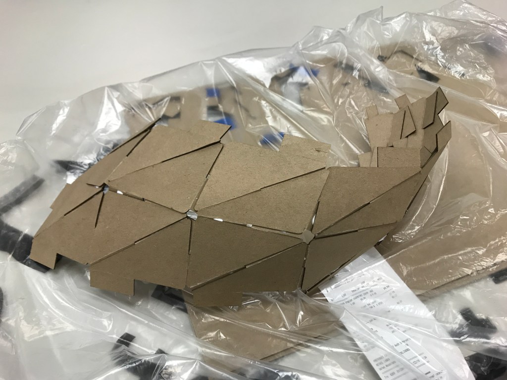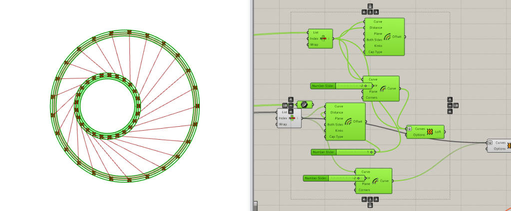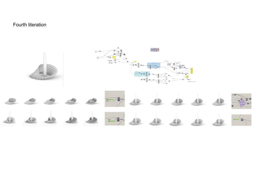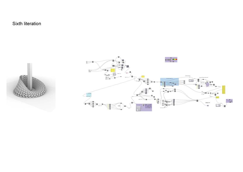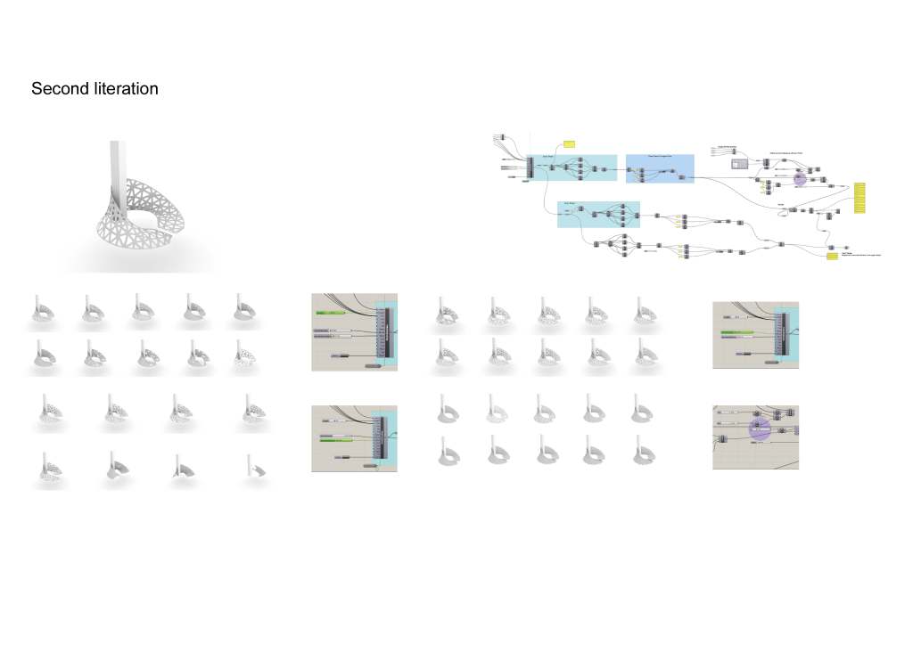 is a parametric free hanging intervention that creates a semi enclosed space with its net-like center. The shape was conceived by connecting two differently sized rings. Physics simulations were applied to identify how the connections would drape in real life. Through iterative prototyping, several hundred panels were cut and assembled that could not only support each other when linked but can also be printed flat on a laser cutter bed.