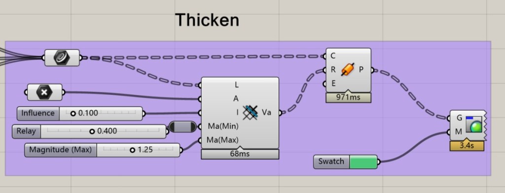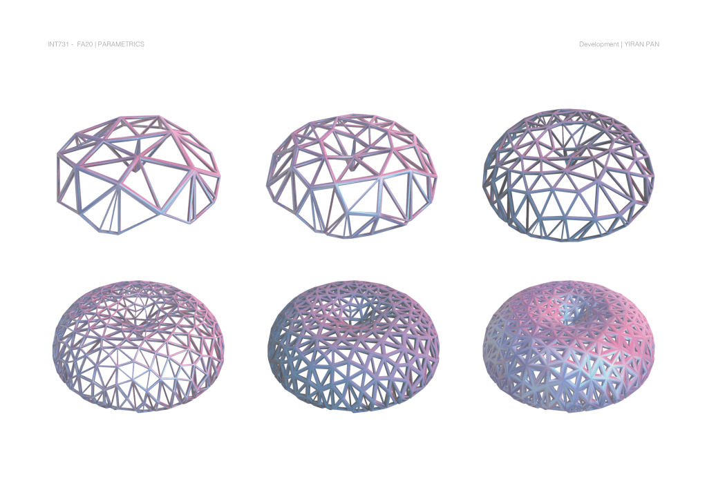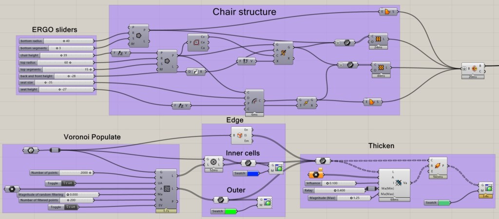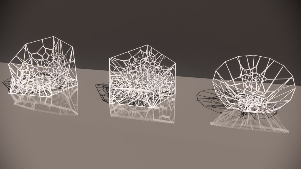 My Product family focus on the ergonomics of the human body and its relation to the chair. I started with the chair structure to have control of its polygon segments, heights and size of the chair and seat. After that, I populated the chair with voronoi cell with the attractor points to control the density of the cells. The back support and the seating is definitely the most dense part. The last step was to thicken the wires with meshes. The different thickness responding to different parts of the chair is also considered, where the part that touches the ground is thicker than the upper part.