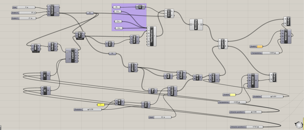 I used tween through curve and rotate the shapes to create 2D pattern. I remap the tween through and rotation with the same attractor position, and I’m trying to figure out how can I separate them. And the rotation doesn’t seems change a lot.