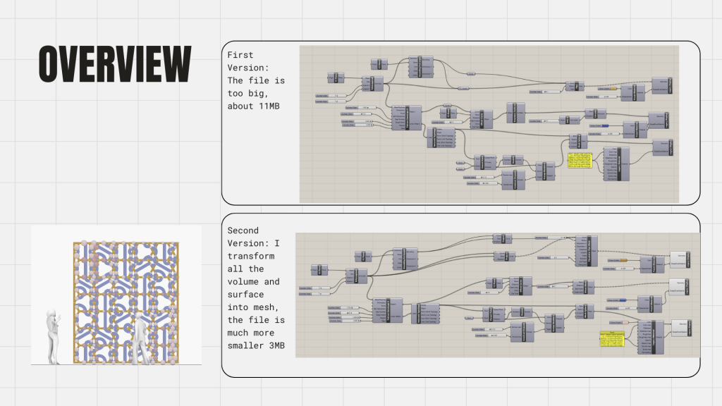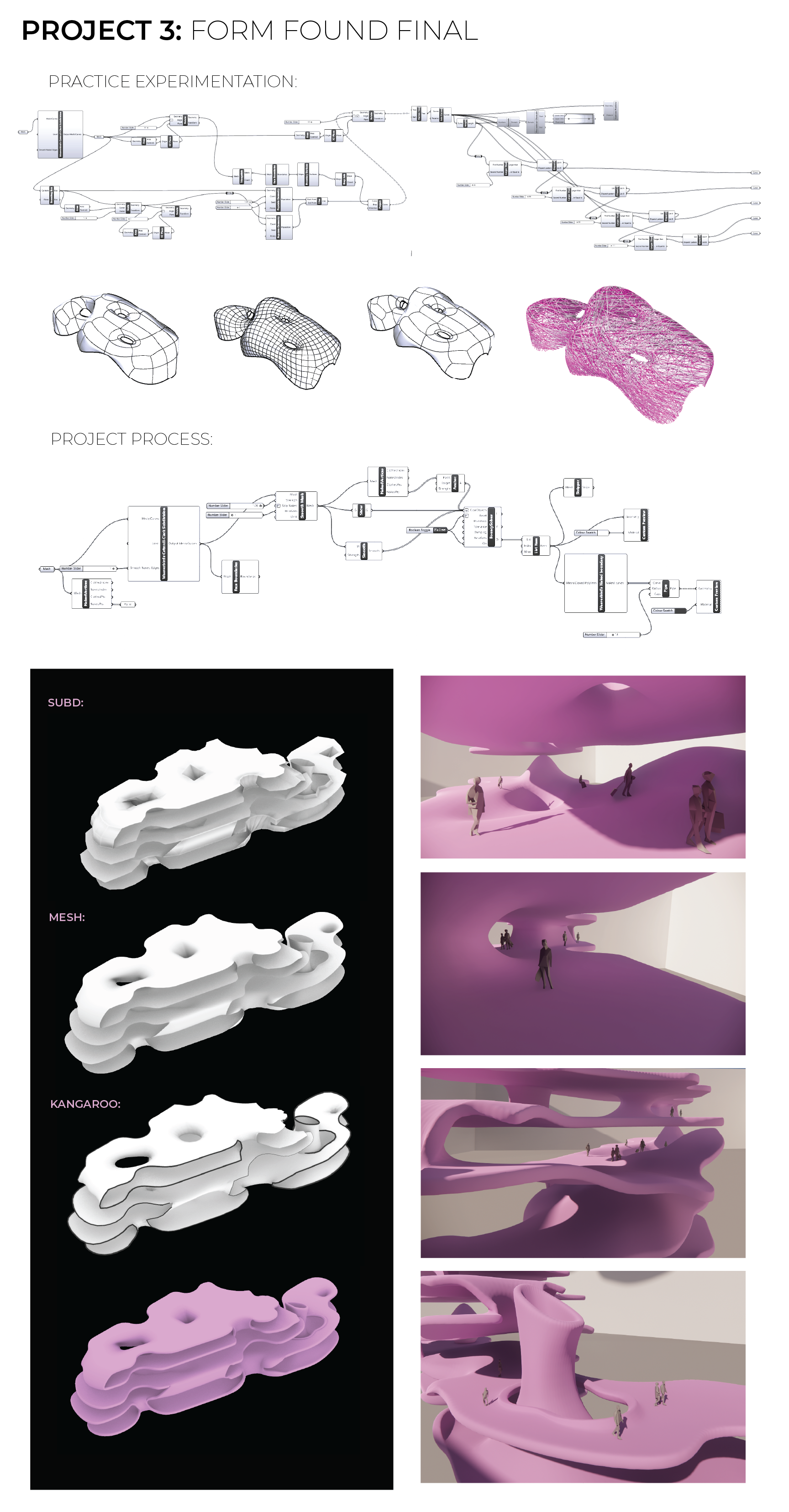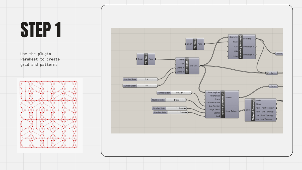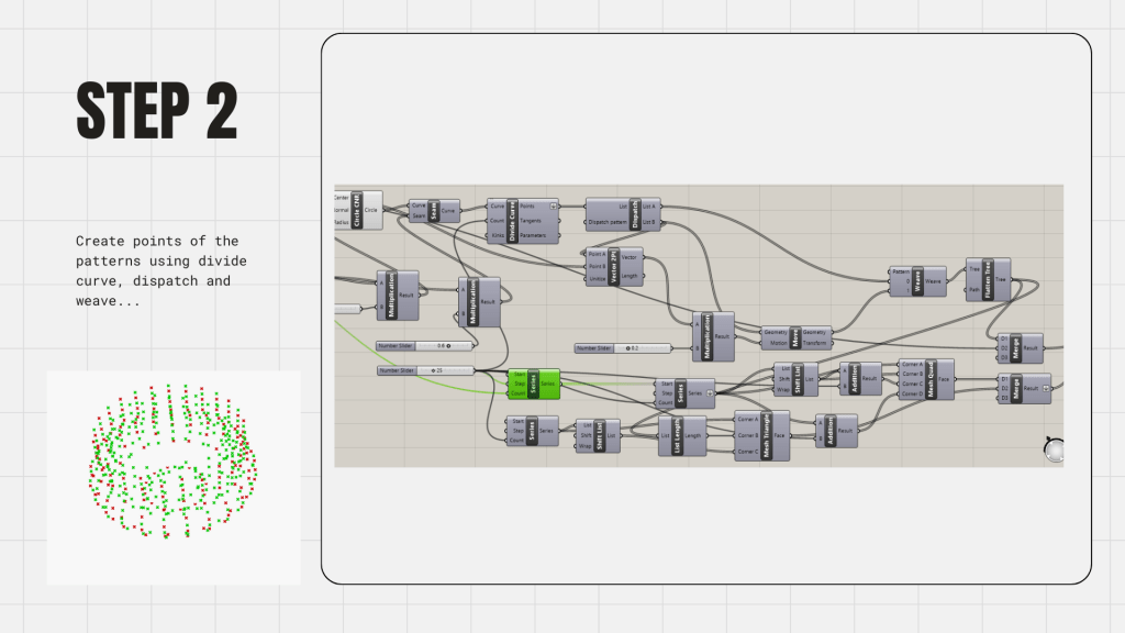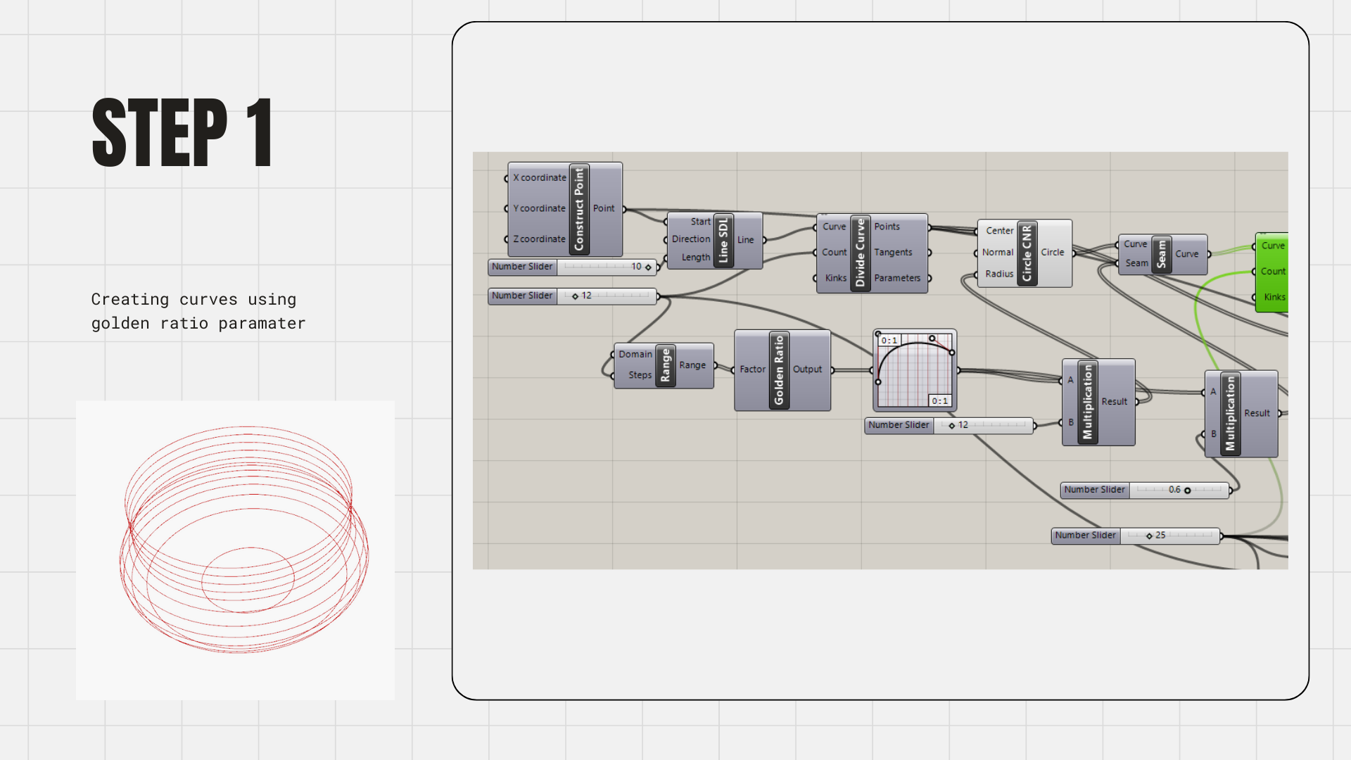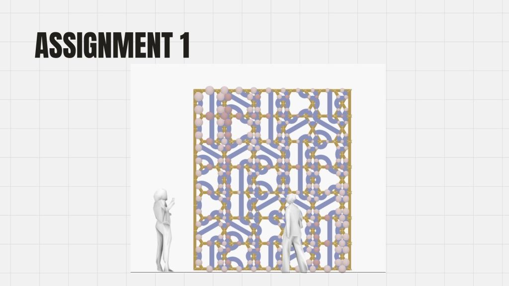 Hi everyone! For project 1 my goal was to get a field of shapes of my choosing to follow an attractor point. I had the attractor point follow a swirly line over the grid. The cones around the point get smaller. I would have like to get it so that the tops of the cones, would almost flop away from the attractor point, but that was a bit advanced for my grasshopper knowledge at the beginning of the semester. At the beginning of the semester, I struggled a bit to get the materials I wanted, and to get the colors alternate every other pyramid figure, but I ended up working through it. I include the slides, a close up picture, the gif of the slides, and the grasshopper coding I used.