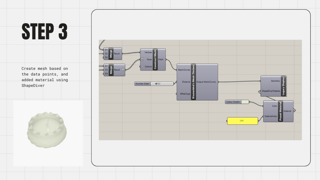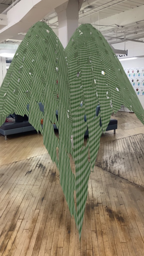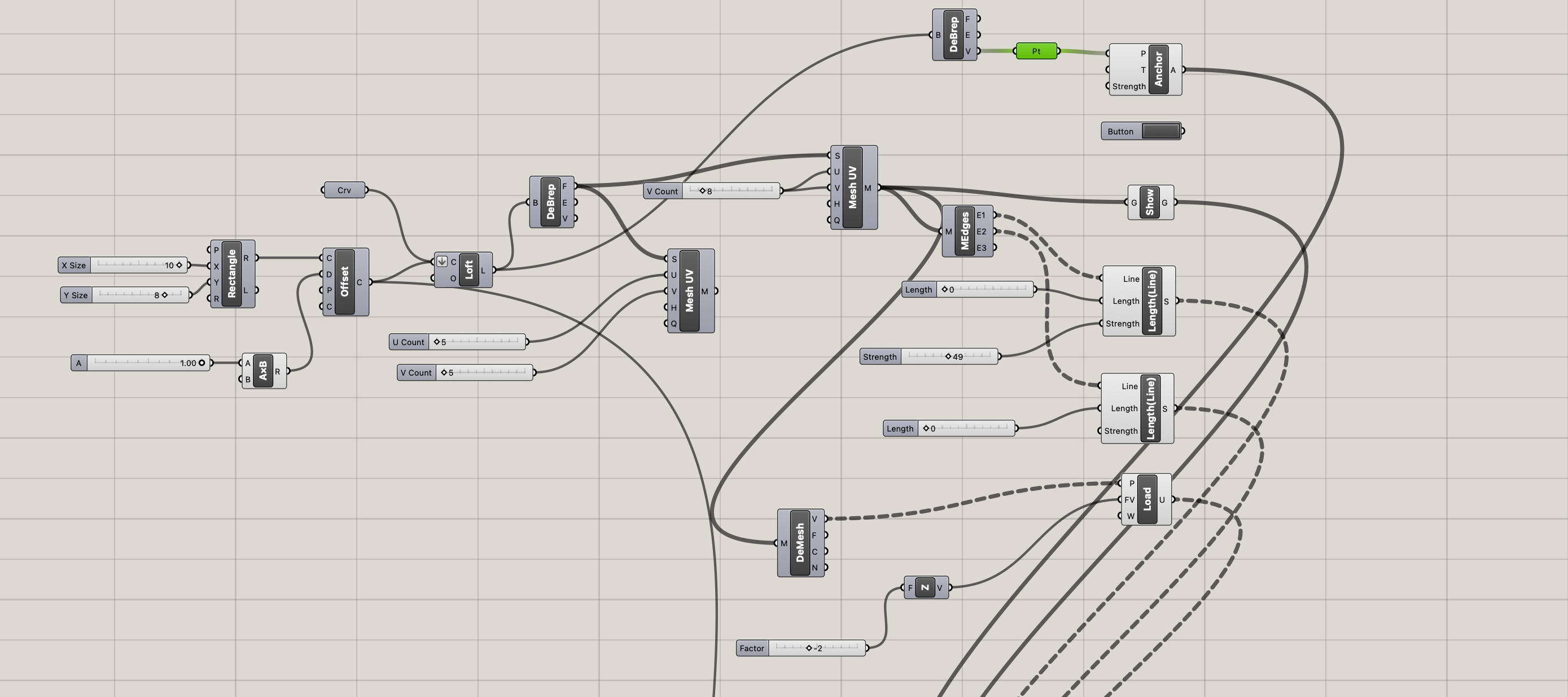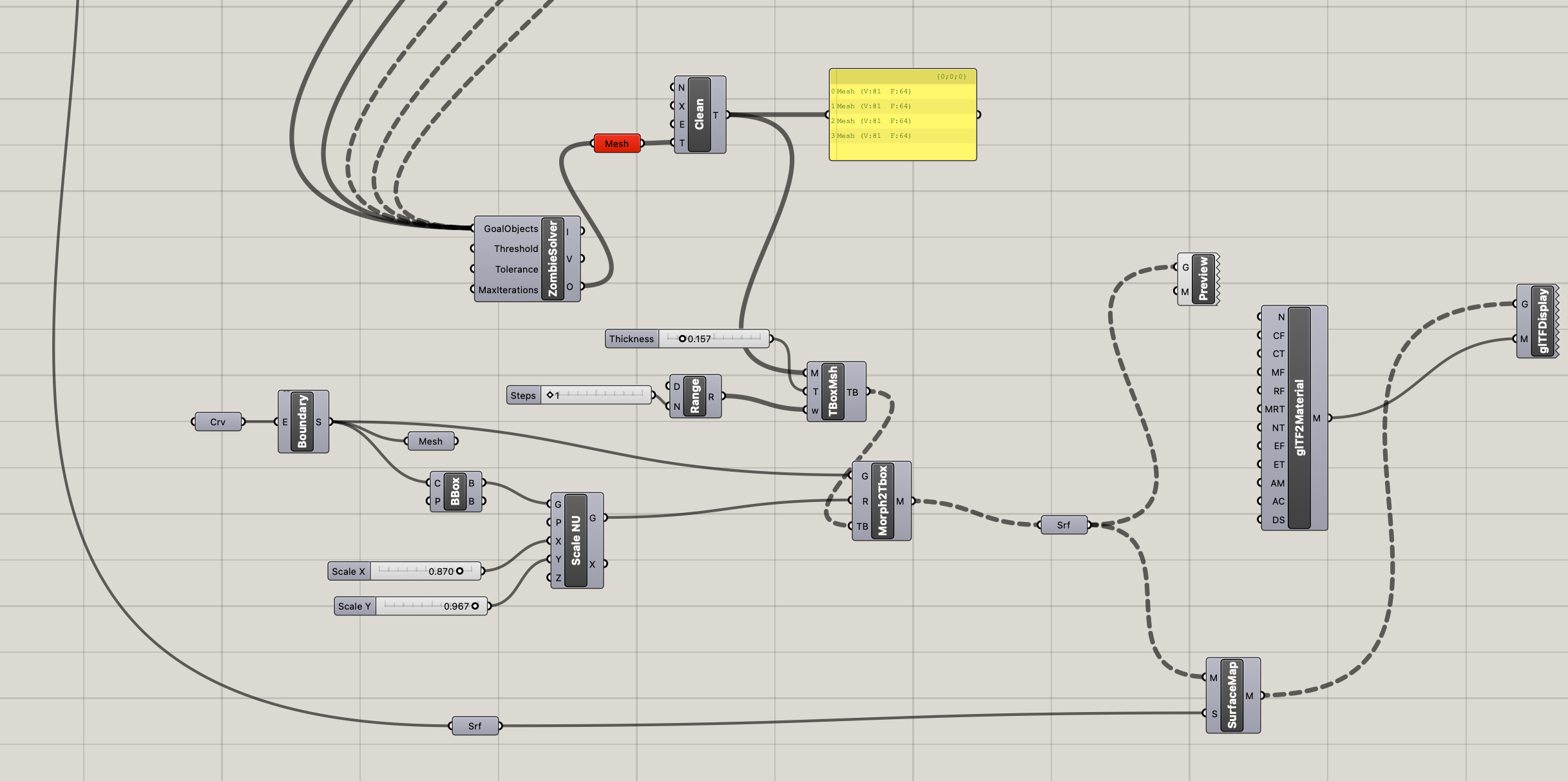 Some of you may knew that for my thesis one of goals is create tensile structures out of reconstructed thrifted material, specifically old t-shirts. Around halfway through working on this project, I was able to get the t-shirt pattern I wanted projected onto the umbrella structure I made, but there was nothing special about the code. I wanted the t-shirts to actually be individual meshes that were somehow linked together.
