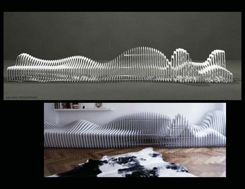 Sitscape is a seating system that the architecture firm, Hackenbroich Architects, designed to accommodate various relaxed positions. First, I had to analyze the object and locate the transition points within the form and create those specific section geometries with Curves. After building several curve geometries, I created interpolation points that ran across all the sections. I then used a NetworkSurface, referencing the interpolation guide points and selecting all the curves, in order to create the solid form. Next, I created contour lines @ 2.5” spacing and deleted the form, leaving me with several curves.