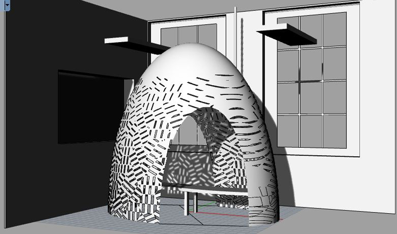 Here is another one of our concepts for the canopy. It is a structure to create and enclosed space around a bench. There are two openings – one on either side of the bench. From one side of the bench you have a view into the room and from the other side of the bench you have a view out the window. From a given perspective in the room, one person is concealed and one person is revealed, creating a semi-private conversation space.