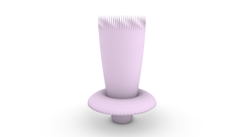 This vessel is inspired by the shape of water ripples and splashes. The rich form of this vessel has multiple functions, which can be used as a flower arrangement and a fruit tray. It consists of two parts, the low flat bottom can be used for fruit placement, and the slender tubular structure in the middle can be used as a flower arrangement vase. This container will be made of silver metal, and the reflected luster is like sunlight refracted by water waves.