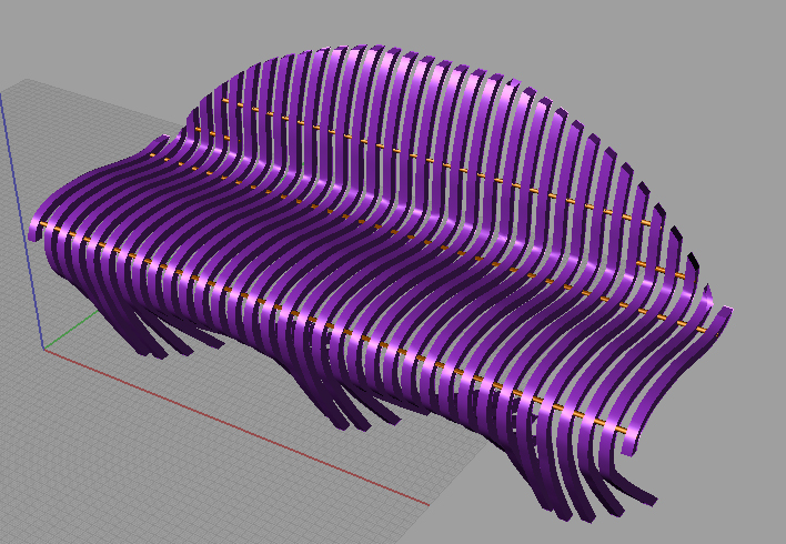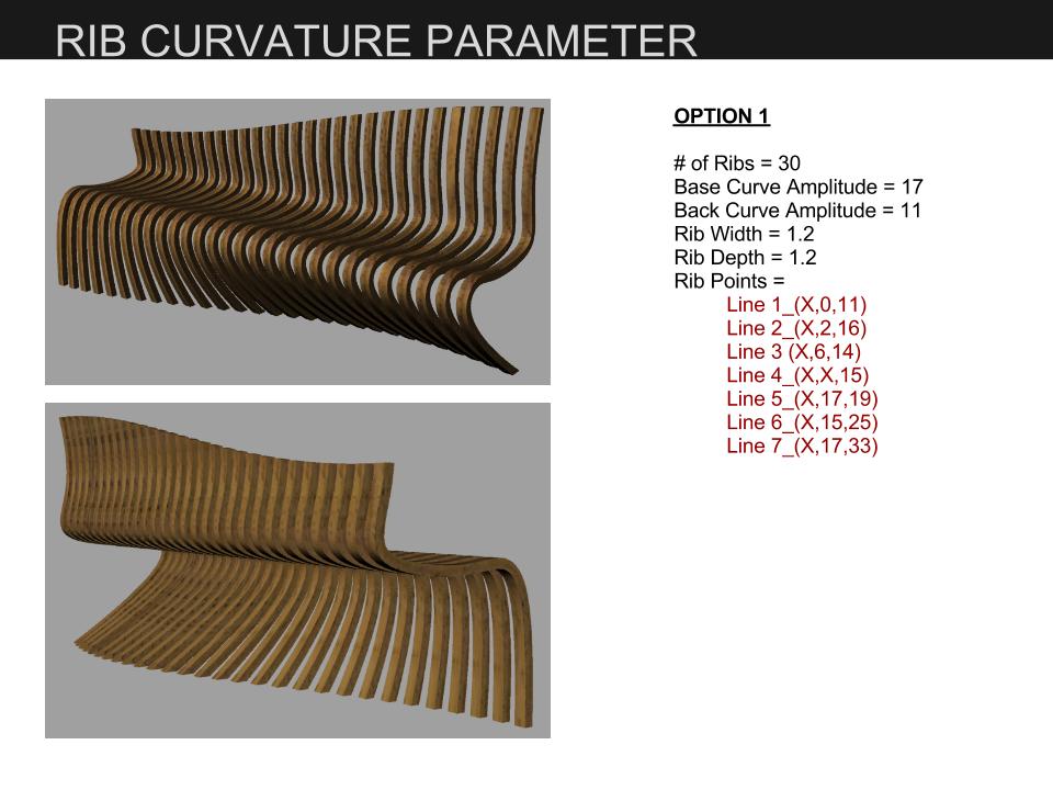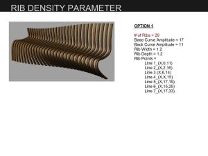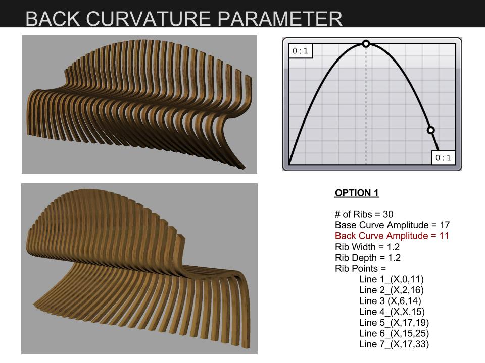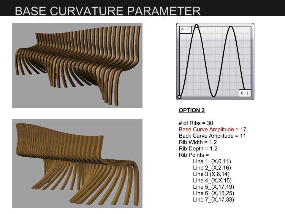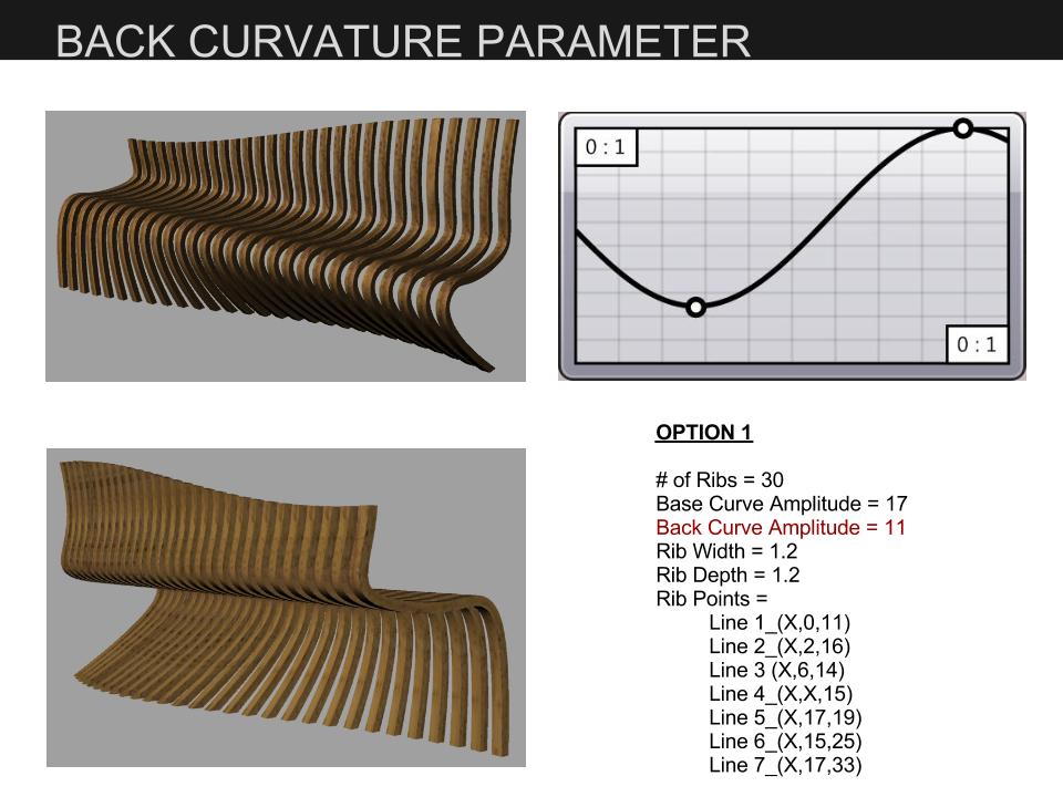 For my bench I wanted to adjust the curvature of the form. I accomplished this by creating parameters that allowed me to modify the base curve, the back curve, and the shape of the ribs. For the base and back curves I used the graph mapper tool to change the shape of the curves. The process I used to build the ribs allowed me to play with the form. I created points that I drew a curve through to generate the ribs. I attached sliders to Y and Z values of the points so the curvature of the ribs could be adjusted.