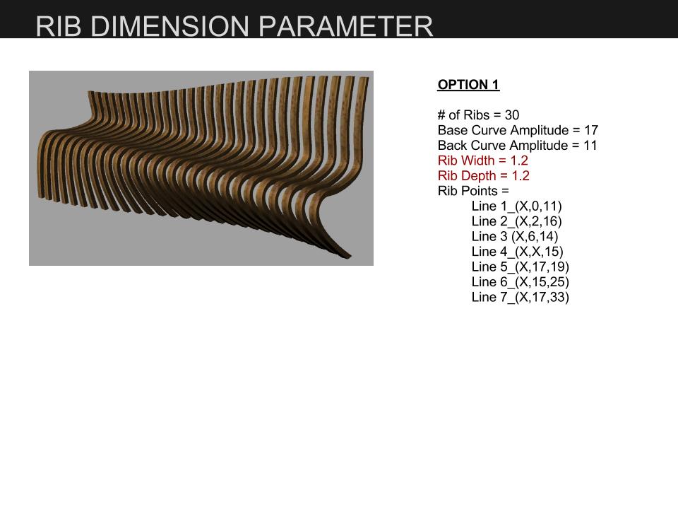 Since my bench is composed of ribs I wanted to play with the density and dimensions of the ribs to further change the look of the bench. I was able to adjust the number of ribs and the width and depth of the ribs by using sliders. To create the parameter for the number of ribs I first drew a line in Rhino and divided it in Grasshopper. I attached a slider to control the number of divisions. I built the ribs referencing the division points so when I moved the slider to change the number of divisions the number of ribs also changed. To modify the width and depth of the ribs I used the offsetting tool and attached a slider to it.