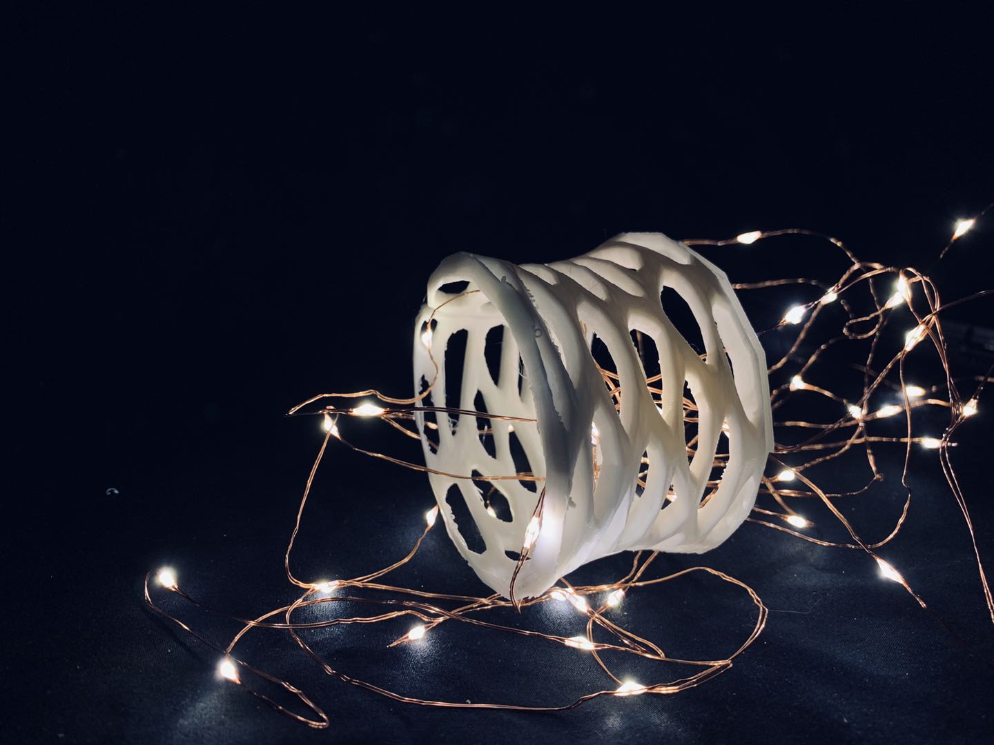 I selected semi-clear plastic as my material to 3-d print for its effectiveness of translating light in a soft and gentle way. I also used two different colors of light source in order to make the effect of the changing surfaces of the geometric  transformation, which the change of wall thickness and angles of faces change the way light translate through the body of the products.