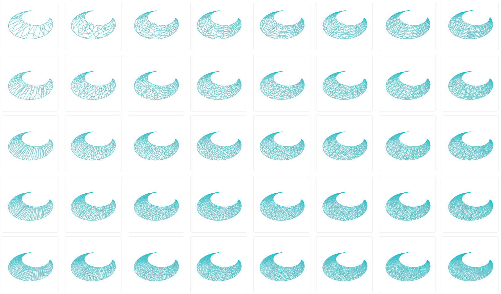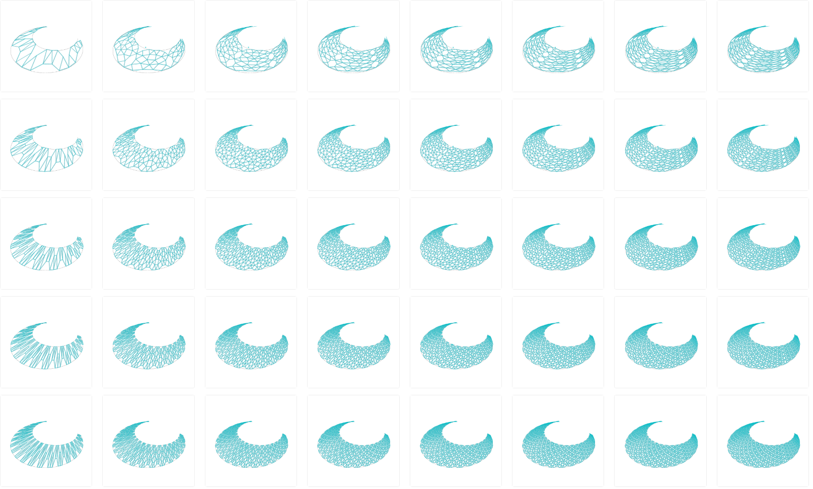 This project was initially inspired from iron tower which has a intricate appearance and strong wire construction. My intention was to create vessels with multiple functions. In order to do that, I made the project super flexible in regards to the size of the object, points of division, size of openings, density and thickness of lines. As you adjust the variant, the vessel becomes vase, basket, or pen container.