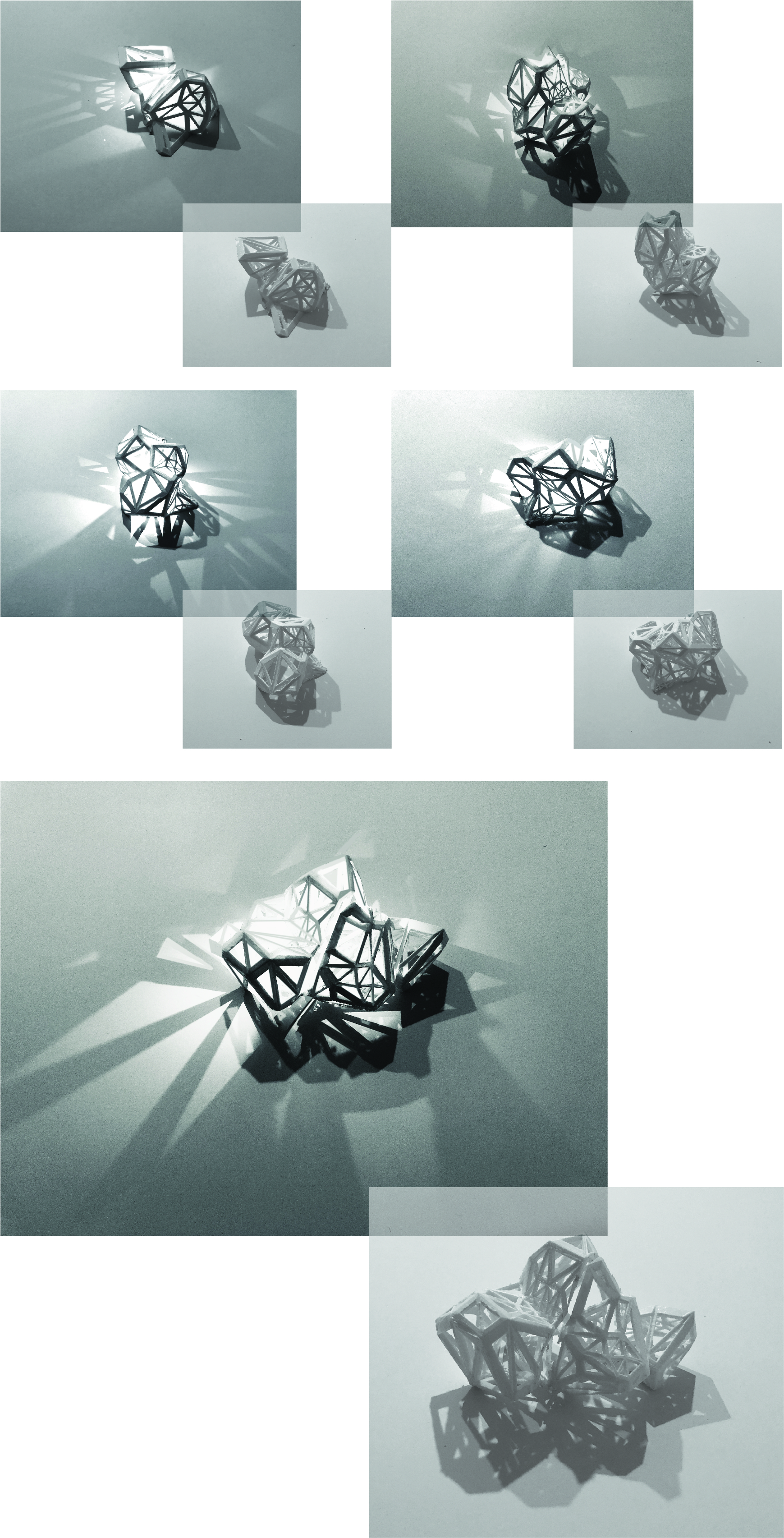 This design was mainly inspired by the organic formation of bubbles as they layer on top of each other. The intention was to create a web-like light that would be able to cast interesting shadows on the surfaces of objects below, in order to add removable pattern textures to any surrounding objects. This allows non-permanent patterns to be created as well as allows for there to be changes in the space depending on ethereal qualities. The changes throughout the day will allow this light to incorporate the aspect of time as well into the design. I wanted the shape of the object to be more randomized rather than organized, just like how foam would naturally form without any particular shape and order. Therefore, there is no particular structured look to the project and the light needs to be hung because there is no set base. It really depends on which component numbers you decide to mix together in order to determine whether or not it will be able to stand.